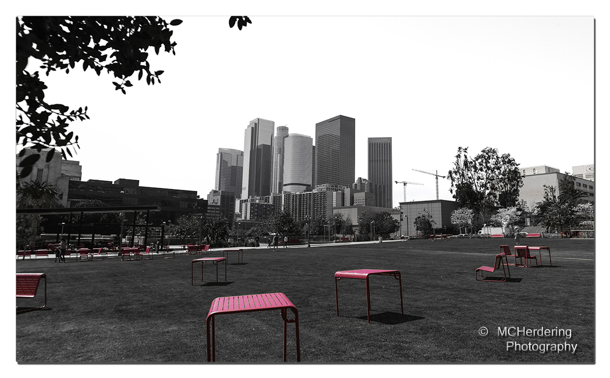 If you've never been to Grand Park in downtown Los Angeles, you might be surprised to see the pink lawn furniture scattered about. I thought this was a good scene for a selective color black and white image.